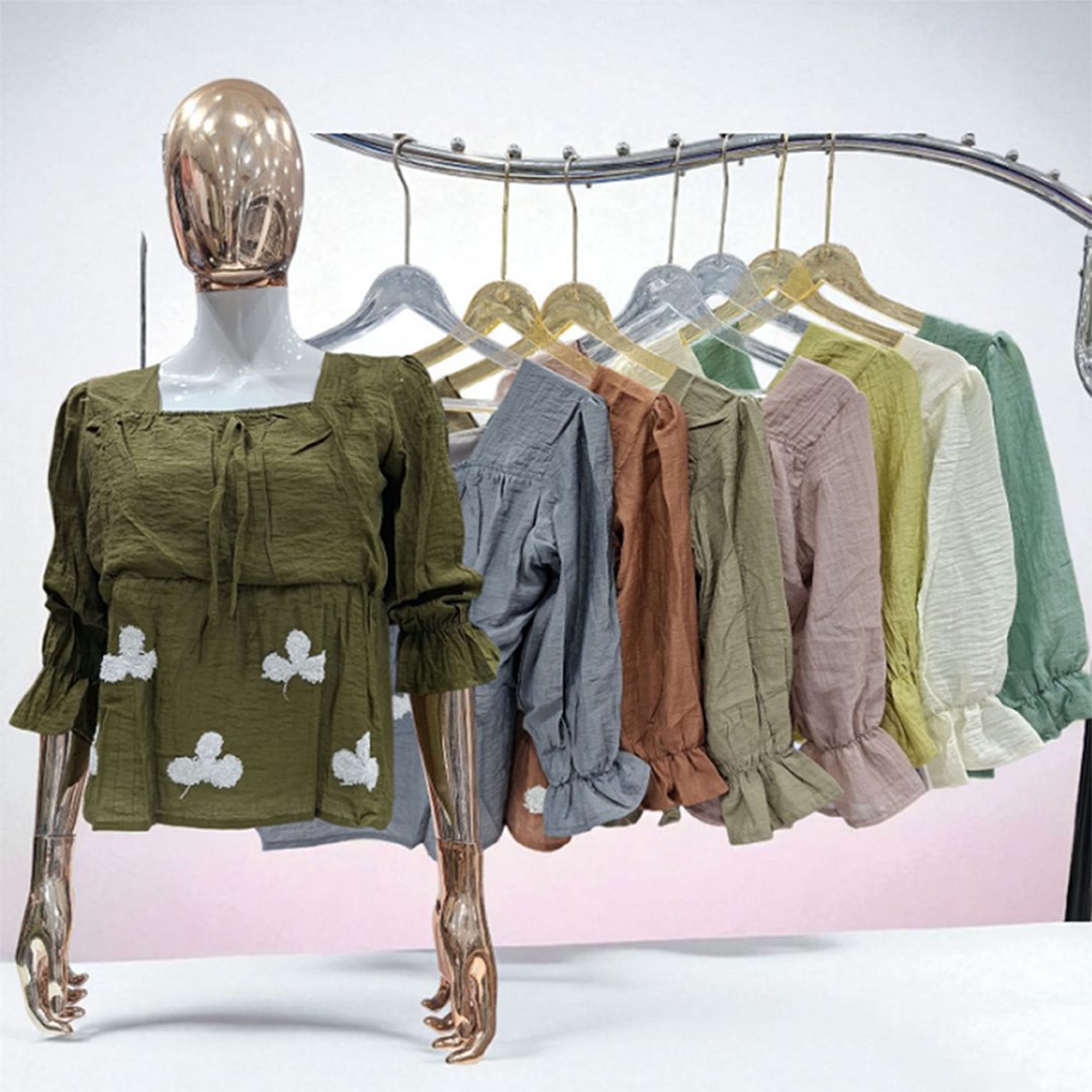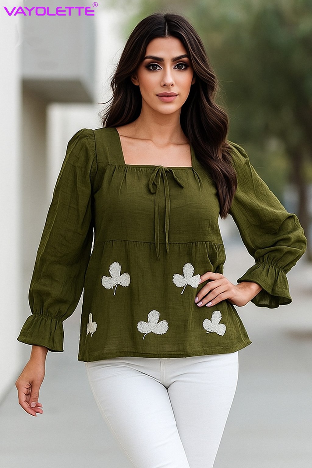 Elevate your wholesale collection with the Vayolette MD 451 Women’s Cotton Top, a best-selling design crafted from soft, breathable cotton. This trendy blouse features a square neckline with tie-up detail, delicate floral embroidery, and 3/4th sleeves with gathered cuffs, making it a versatile choice for women’s everyday fashion.