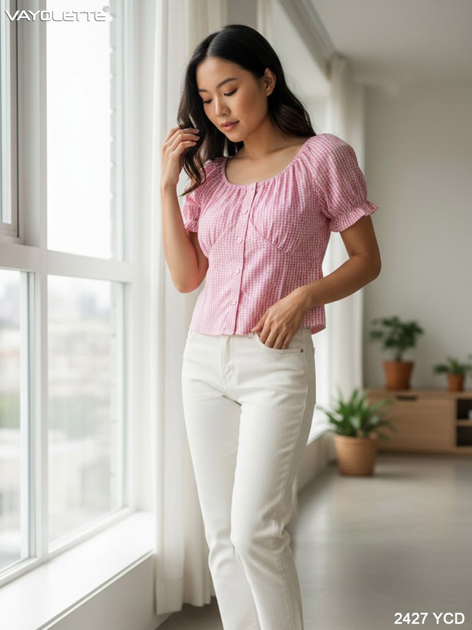 Bring timeless checks and modern tailoring together with this Women’s Puff Sleeve Checked Shirt (Style 2427 YCD), designed to meet the demands of today’s fashion-forward customers. Made from premium cotton gingham fabric, this shirt offers a soft feel, excellent breathability, and lasting comfort—perfect for daily wear and seasonal collections.